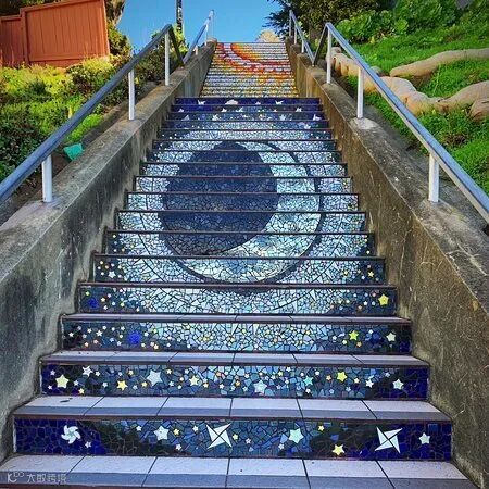 163级台阶共用75000个瓷砖碎片、镜子、彩色玻璃组成,描绘了一个从太阳到海底的梦幻世界。