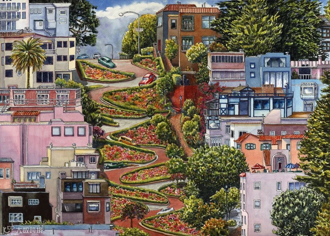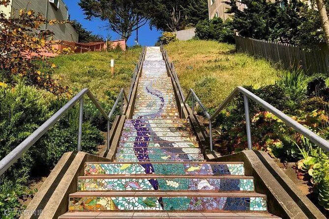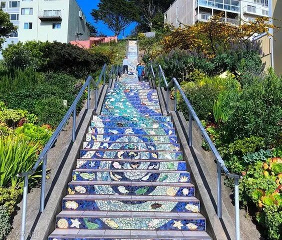 楼梯两旁种满鲜花和多肉植物,吸引人一步步走上山,拾级而上的尽头能俯瞰西旧金山全景。