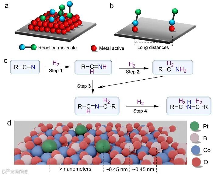 图1.(a)反应物在过渡金属纳米粒子上的可能吸附构型;(b)反应物在单原子金属位点上的吸附构型;(c)苯甲腈加氢至二级亚胺的可能反应步骤;(d)具有特定空间构型的单原子Pt-路易斯酸性B双位点催化剂。