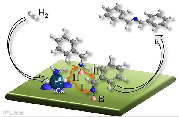 图3. 具有特定空间构型的单原子Pt和路易斯酸B双位点催化苯加氢加氢至二级亚胺的可能反应过程