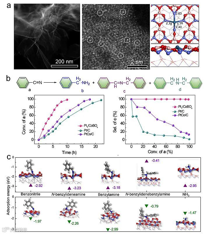 基于上述问题,西北工业大学瞿永泉教授课题组在单原子Pt位点周围引入与Pt空间距离为0.45 nm的路易斯酸性的B第二活性位点,构建了单原子Pt和路易斯酸性B双位点加氢催化剂(图1d)。如图2a所示,在具有特定晶型的硼酸钴表面,单原子的Pt以取代硼酸根的形式稳定在催化剂表面,从而与其周围的B原子组成了Pt-B双位点催化剂(Pt1/CoBOx)。值得注意的Pt在该位点与金属钴相互配位,形成Pt-Co键。但是由于Co处于次表层,并且配位饱和状态,不能够与其他反应物相互作用。相比于传统的Pt/C或者PtCo/C催化剂,在相同的反应条件下,Pt1/CoBOx催化剂表现出最优的催化活性,以及超过99.9%的二级亚胺的选择性(图2b)。进一步通过DFT模拟发现(图2c):单原子Pt和路易斯酸性的B位点对苯甲腈、一级亚胺和苄胺的吸附强度都相对较强,这样就保证了反应过程中这些中间产物的脱附;同时,对二级亚胺的吸附则较弱,保证了目标产物的脱吸附,避免过度加氢的发生。