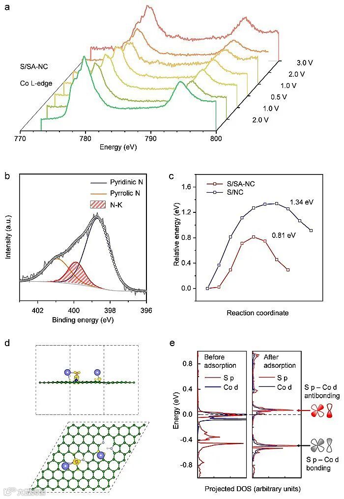 Figure 2. (a) Ex situ NEXAFS of Co L-edge of S/SA-NC in varying discharge and charge states. (b) N 1s XPS spectra for pristine and fully discharged S/SA-NC. (c) Energy profile for K2S dissociation on SA-NC and NC. (d) Charge difference analyzes from transition state of K2S dissociation on SA-NC (upper: side view, bottom: top view), in which yellow-color and cyan iso-surface represent electron accumulation and electron depletion, respectively, and iso-surface value is 0.005 e Å-3. The green, blue, light blue, pink, orange and purple spheres represent, respectively, C, Co, N, H, S and K atoms. (e) DOS of S p and Co d before and following K2S adsorption on SA-NC.