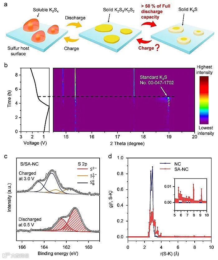 钾硫 (K-S) 电池的理论质量能量密度高达 1023 Wh kg-1且成本较低,在大规模应用中具有实际前景。然而,在整个过程中,K2S3- K2S间转化的理论容量约占总容量的 67%。虽然这种固-固转化在热力学上是可逆的,但由于动力学缓慢,放电/充电反应通常会因高过电位而终止。更重要的是充电过程中K2S的电化学氧化动力学缓慢,容易形成“死”硫物质。这导致硫氧化还原的利用率仅为 40%,同时 K-S 电池的容量损失严重(图1a)。