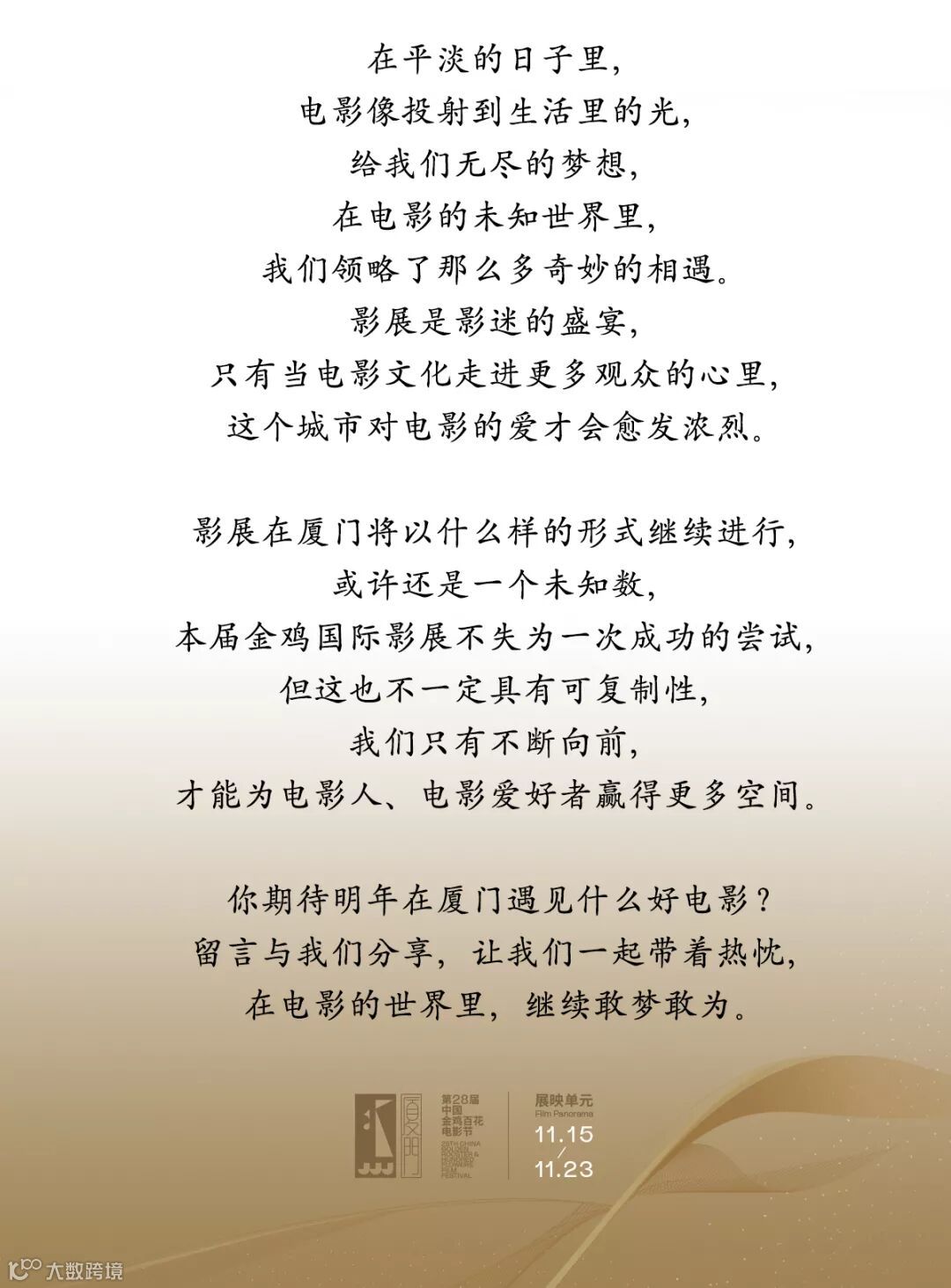 这些数字背后,或许都凝结着金鸡国际影展组委会,和金鸡展映单元执行团队厦门文广电影控股有限公司的共同努力。