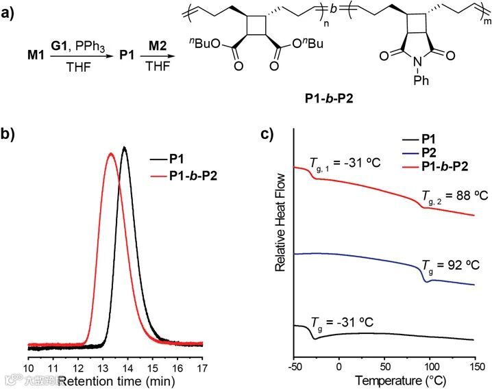图4. (a)通过相继加入两种单体合成嵌段共聚物;(b)P1均聚物的GPC曲线(黑色)以及嵌段共聚物的GPC曲线(红色);(c)P1(黑色)、P2(蓝色)以及嵌段共聚物(红色)的DSC曲线。