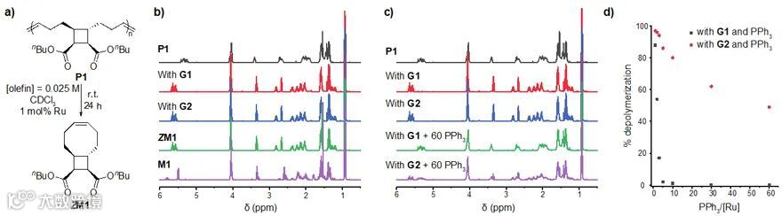 图5. 聚合物的解聚实验。(a)解聚反应式;(b)黑色为聚合物解聚前的核磁氢谱;红色和蓝色分别为常温下使用Grubbs I和Grubbs II解聚24小时后的核磁氢谱;作为参考,绿色和紫色分别为顺式及反式单体;(c)黑色为聚合物解聚前的核磁氢谱;红色和蓝色分别为常温下使用Grubbs I和Grubbs II解聚24小时后的核磁氢谱;绿色和紫色分别为常温下使用Grubbs I和Grubbs II并加入60当量三苯基膦尝试解聚24小时后的核磁氢谱。(d)使用不同当量的三苯基膦时的解聚率变化。