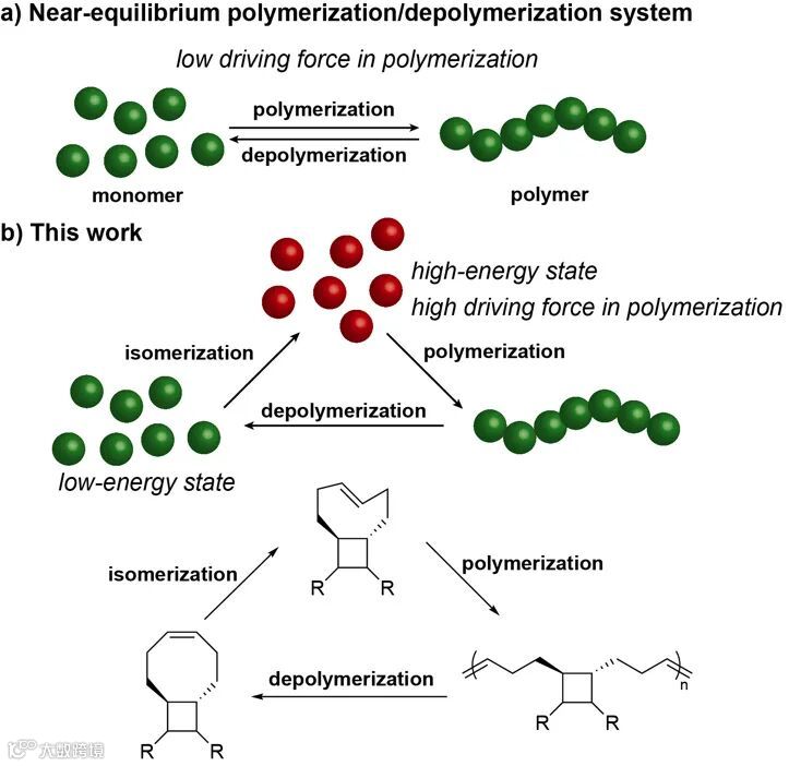 图1. 与传统可解聚聚合物的比较。(a)接近平衡的传统可解聚系统拥有较低的聚合驱动力;(b)通过单体的异构化获得高能量异构,提高聚合的驱动力,而所得的聚合物可以解聚到低能量的异构体。