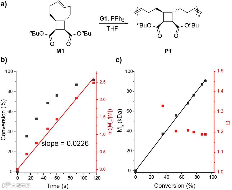 图3. 聚合反应的动力学研究。(a)聚合反应的反应式;(b)转化率(黑色)以及ln([M]o/[M])(红色)根据时间的变化;(c)数均分子量(黑色)以及分散度(红色)在不同转化率下的变化。