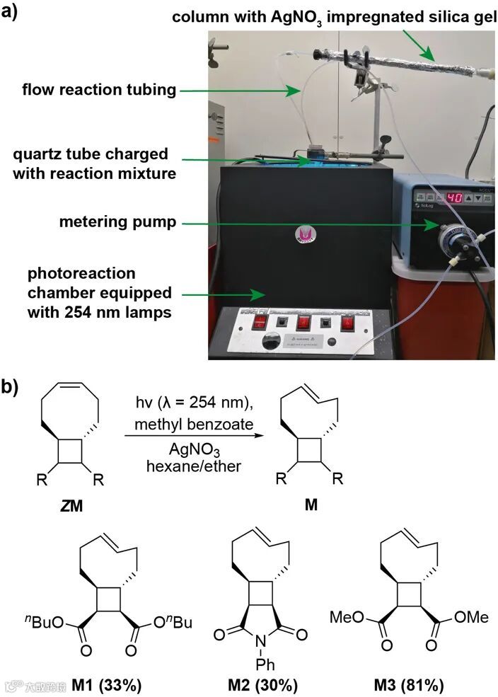 图2. 烯烃的光异构化反应。(a)反应装置;(b)反应式及所制备的单体结构。