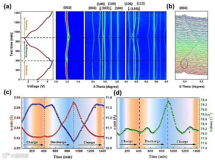 图2. (a)原位同步辐射,(b) (004) 峰位偏移图,(c)晶胞参数a和c变化图,(d) 晶胞体积变化图。