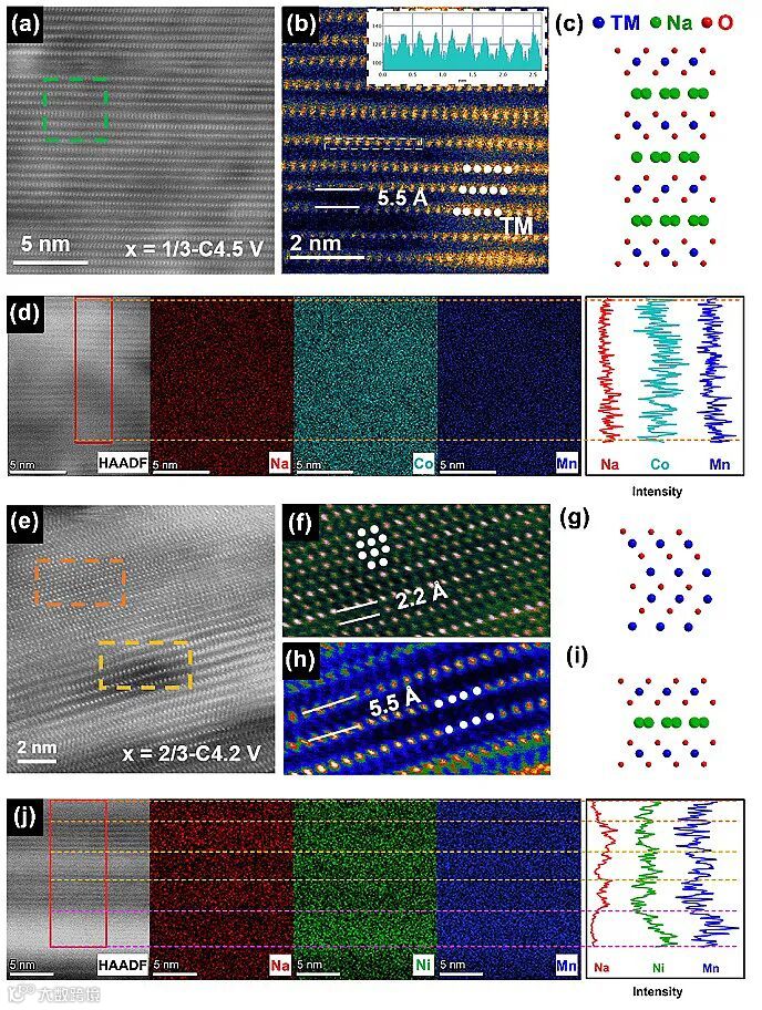 图4.(a-d) Na0.2Mn1/3Co2/3O2球差电镜表征,(e-j) Na0.2Mn2/3Ni1/3O2球差电镜表征。