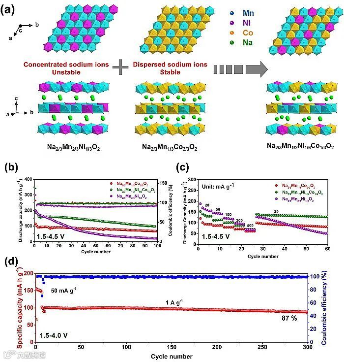 在Mn-Ni-Co体系中,理论上镍离子显+2价,钴离子显+3价,为了维持晶体结构中局部区域化合价平衡,在Ni-O八面体周围需要两个钠离子,而Co-O八面体周围需要一个钠离子,通过对正极材料的成分调控,可以改变结构中钠离子的分布(图1a)。通过成分调控,优选的成分Na2/3Mn1/2Ni1/6Co1/3O2能够同时兼备高容量和高稳定循环的特点(图1b-d)。