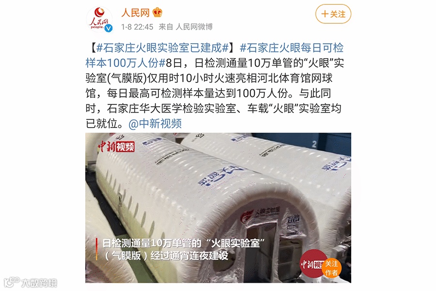 现在“火眼”实验室(气膜版)仅用10小时基本建成,21小时投入使用。气膜舱充满气体只需50分钟左右,设备进场后直接组装,每日最高可检测样本量达到100万人份,打造了最新“中国速度”。为突发疫情防控贡献了数百万例新冠检测,及时精准高效的排查将有助于最大限度地缓解社会危机。“火眼”实验室被多家海内外知名媒体报道,北京的“火眼”实验室入选了国际顶级期刊《Nature》7月最佳科学图片,产生了极大的国际影响力。