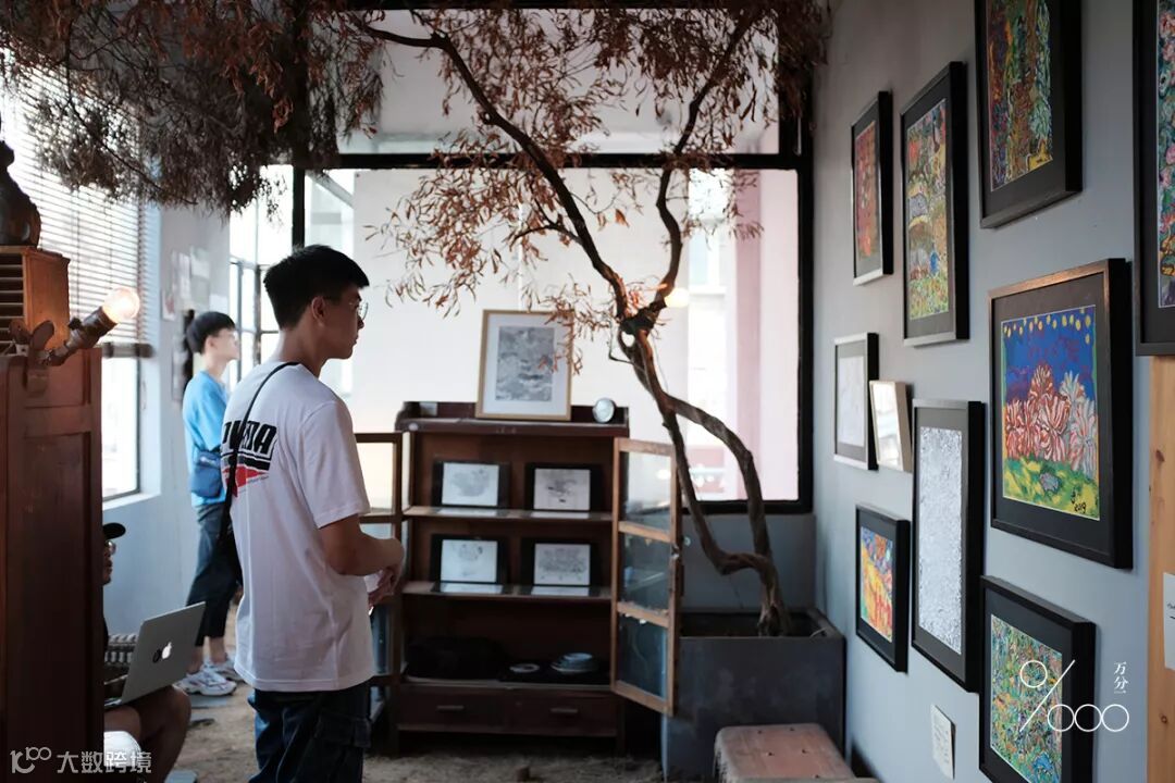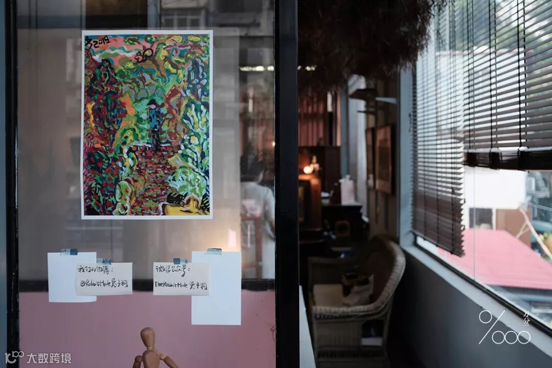 邦尼正在为一位多年的好友举办一场画展,墙上挂满了作者天马行空色彩丰富的画作,偶有几位轻声细语的参观者前来。在楼下是成群结队的游客衬托下,「兔子洞」格外静谧。