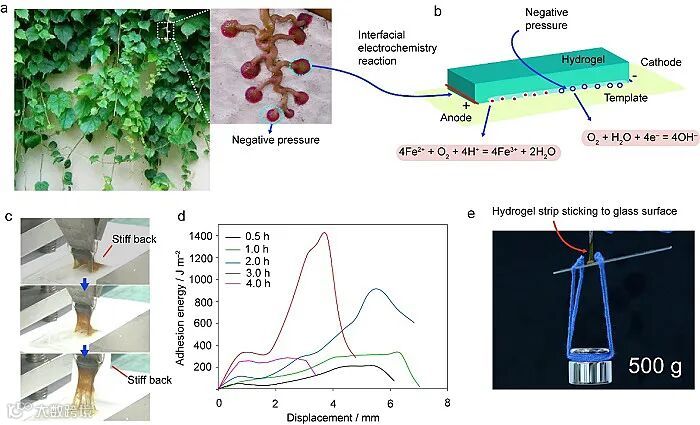 作者受到爬山虎强粘附的启发,提出了电化学功能化水凝胶与基底之间超强粘附机理。爬山虎有许多吸盘结构,由海绵状微孔和微管结构组成。微孔的主要功能是分泌和累积植物激素,微管的主要功能是运输植物激素。当吸盘与基底接触时,植物分泌物氧化消耗内部氧气,同时,由于绿色植物的光合作用,大量氮气被消耗。氧化反应和光合作用消耗大量气体,吸盘内的密闭空间形成负压从而加强了爬山虎吸盘与基底的粘附强度。与爬山虎的吸盘相似,电化学功能化水凝胶与玻璃板之间的粘附力也可以归因于类似于爬山虎的强粘附机制。当柔软的水凝胶与亲水性基材(载玻片)接触时,由于凝胶本身的粘性以及界面处的氢键相互作用,二者可相互粘合。但是,该粘合性较弱,水凝胶容易从基底上剥离。将电压施加到水凝胶的两端时,一系列电解反应可在水凝胶内部触发氧化反应(4Fe2++ O2 +10H2O ⇌4Fe(OH)3↓+ 8H+)消耗水凝胶与基质之间的氧气,增加了凝胶与基底之间的接触面积。再者,电化学功能化过程在“L区域”与“H区域”引入大量的氢键作用,增强了水凝胶在基质上的粘附作用。理论测试表明,水凝胶与玻璃基底之间的粘附能可提高至1400 J/m2,远高于肌腱,软骨与其他组织的粘合强度(800 J/m2)。
