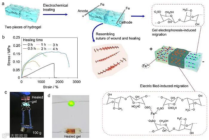 电化学功能化法也可以作为一种有效的凝胶愈合策略,使两片聚丙烯酰胺/κ-卡拉胶水凝胶愈合为完整结构。该愈合机制受到三个因素的支持:1)水凝胶自身具有一定的粘性,水凝胶样条经电化学功能化之前可以紧密接触;2)Fe3+和κ-卡拉胶在电场作用下发生电泳,二者间的离子键在样条接触部位产生新的离子交联网络;3)Fe(OH)3的絮凝作用促进了愈合位点处κ-卡拉胶与聚丙稀酰胺分子之间形成氢键,促进了分子缠结,愈合效率可达到100%。
