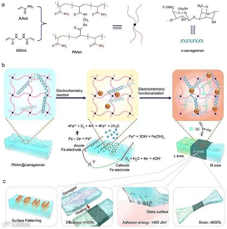 水凝胶由于独特的物理、化学及生物功能特性,已在医学检测、电子皮肤、柔性机器人等领域展现出重要应用。合理的分子结构设计可以实现水凝胶材料在机械强度、界面粘附及自修复等性能的优化提升,然而需要复杂的合成步骤。因此,迫切需要提出一种新型的功能化策略,实现水凝胶多项物理及生物性能的快速提升,为水凝胶的应用带来新的机遇。为此,华东师范大学张利东教授课题组利用电化学反应的特殊环境,结合水凝胶的物理特征,提出了电化学功能化水凝胶新策略,可以快速实现水凝胶强度、粘附及自修复性能的提升,并能通过电极排布实现凝胶表面功能的图案化,赋予了凝胶图案化的传感模式。