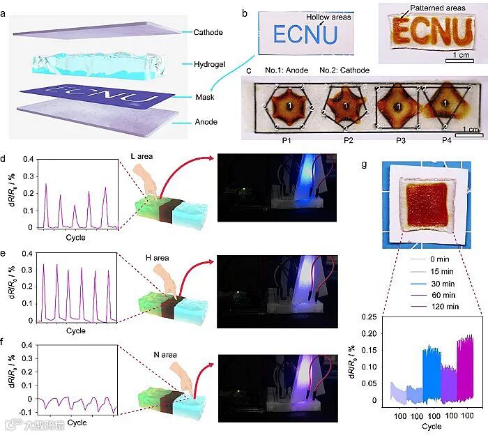 电化学功能化提供了一种高效且易于操作的方法来实现水凝胶的图案化修饰,并使不同模块对外部压力具有差异性的敏感,这赋予了水凝胶更复杂的传感系统。