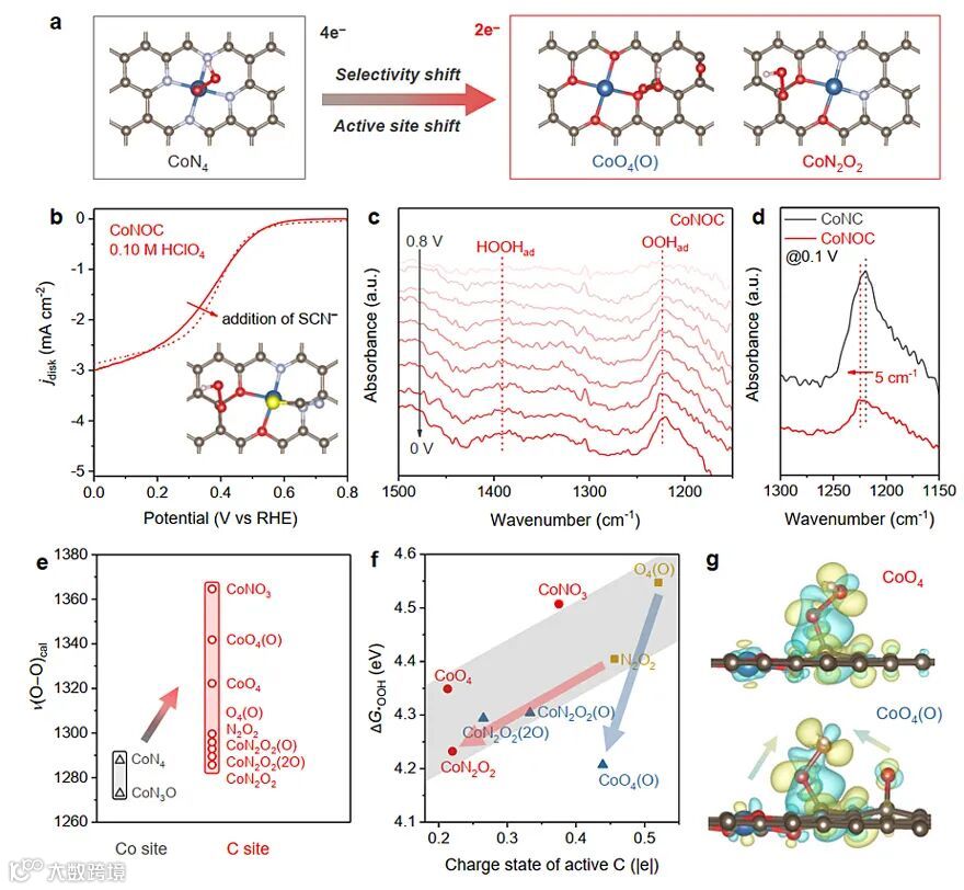 图3. (a) 随着配位环境的变化,*OOH的吸附位点发生了迁移,反应选择性也发生了变化;(b) SCN-的毒化实验;(c) CoNOC的原位ATR-SEIRAS测试;(d) CoNOC和CoNC的原位红外测试中OOH吸附峰的比较;(e) O-O红外振动频率的理论计算;(f) C位点的电荷状态与*OOH吸附能的关系;(g) 第二配位域对*OOH吸附构型和稳定性的影响。