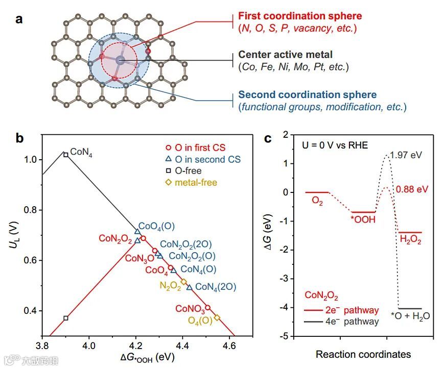图2. (a) SACs结构示意;(b) ORR的热力学过电位与*OOH吸附能之间的火山图;(c) CoN2O2的两电子和四电子路径的动力学比较。