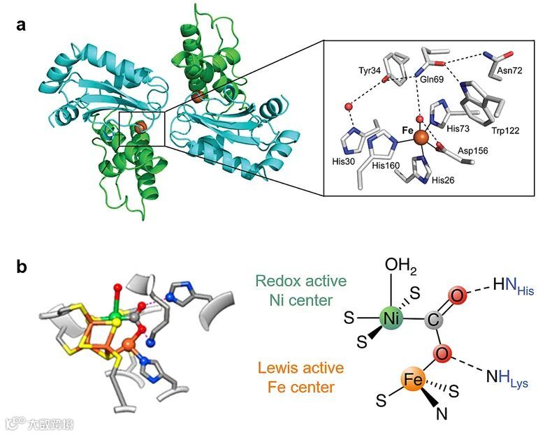 图1. 金属酶的活性中心示意。(a) E. coli铁超氧化物歧化酶;(b) NiFe中心的一氧化碳脱氢酶