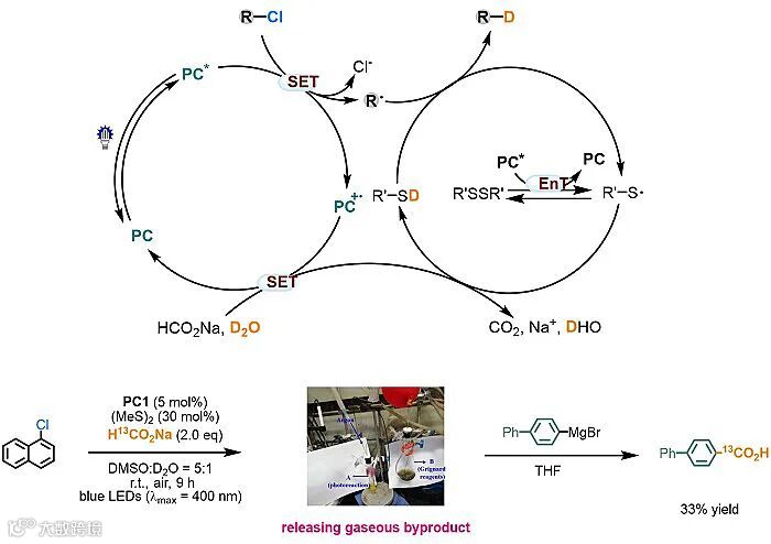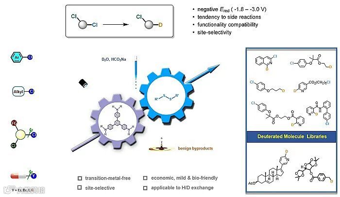 图1. 有机可见光/烷基二硫醚共催化芳基、烷基氯代物的脱氯氘化反应