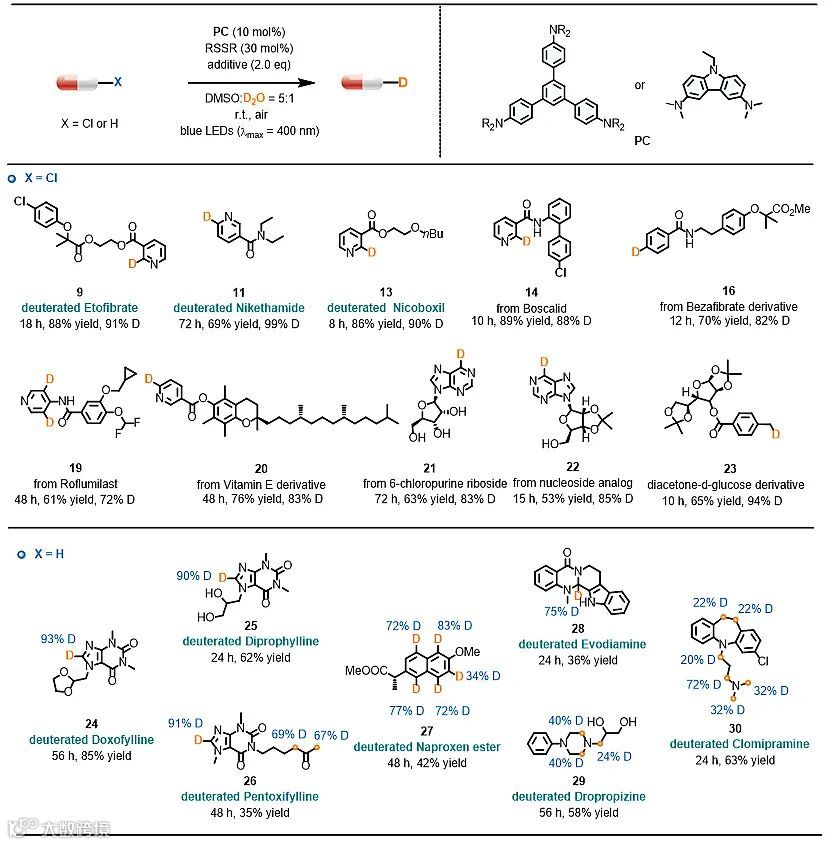 针对上述问题,厦门大学龚磊课题组发展了一种共轭芳香胺和烷基二硫醚组成的有机可见光共催化体系。其中,共轭芳香胺催化剂廉价易得,激发态寿命较长,还原电势高;烷基二硫醚结构简单易调节,具有好的氘转移效率。在可见光照射、室温、空气、DMSO/D2O/甲酸钠等温和的反应条件和经济低毒的试剂作用下,成功地实现了80余种芳基、烷基氯代物的直接脱氯氘化,氘代率最高达99%,反应仅产生CO2、NaCl等副产物。
