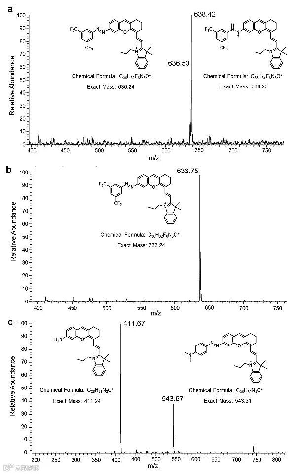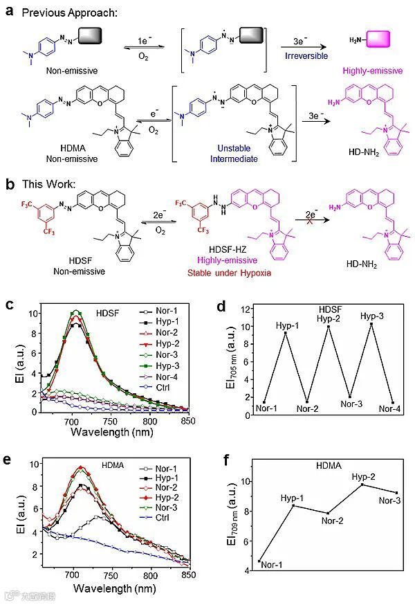 南京大学郭子建/何卫江/陈韵聪团队通过调控取代基的推拉电子效应,改变芳香族偶氮类探针的缺氧还原机理,实现了对循环缺氧的可逆跟踪成像(图1a, b)。作者以偶氮基团桥联近红外荧光团和3,5—二(三氟甲基)苯基,设计出一例近红外荧光探针HDSF。同时合成了含4—(N,N—二甲基氨基)偶氮苯的类似物HDMA。缺氧时HDSF荧光增强,复氧时荧光减弱,且这一增强—减弱过程可多次循环。而HDMA在缺氧时荧光增强,复氧时荧光几乎不变(图1c-f)。质谱跟踪反应发现,缺氧时检测到HDSF(M/Z = 636.50)和苯肼类还原中间产物HDSF-HZ(M/Z = 638.26),复氧后仅检测到HDSF(M/Z = 636.75)。而HDMA体系中,缺氧时检测到氨基还原物HD-NH2(M/Z = 411.67)(图2)。这表明含吸电子取代基的HDSF(荧光微弱)缺氧时还原成苯肼类中间产物HDSF-HZ(恢复荧光),复氧时被氧化回HDSF,由此实现可逆响应循环缺氧。含给电子取代基的HDMA缺氧时还原成氨基物种,N—N键断裂,所以HDMA无法可逆响应循环缺氧。理论计算表明,HDSF中吸电子的三氟甲基稳定了缺氧还原中间产物苯肼,提高了N—N键断裂反应的活化能,因此阻止了该不可逆的还原过程,实现可逆识别循环缺氧。