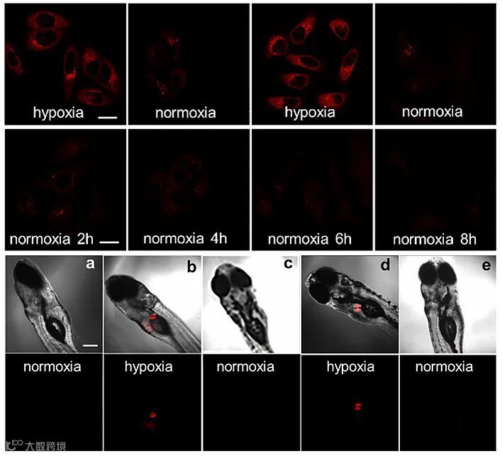 图3. 缺氧—复氧循环下MCF-7细胞和斑马鱼中HDSF荧光的循环变化。