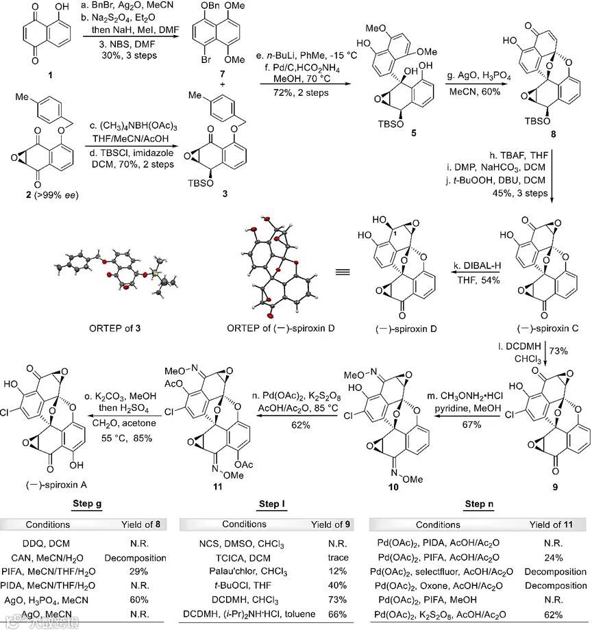 接着,该课题组开展了(–)-spiroxin A、C和D的全合成研究(图3)。从醌1出发通过羟基保护、醌还原甲基化以及溴代三步反应得到7。另一边对2进行区域选择性和立体选择性还原并使用硅基保护,以两步70%的收率得到硅醚3。7通过卤锂交换制得锂试剂对3进攻,接着脱除苄基以及4-甲基苄基,以预期的立体选择性得到单一的非对映异构体产物5。5在AgO/H3PO4条件下实现氧化和螺环缩酮骨架的一步构建得到缩酮8,8通过三步转化实现了(–)-spiroxin C的不对称全合成。(–)-Spiroxin C经过DIBAL-H的区域选择性和立体选择性还原实现了(–)-spiroxin D的首次不对称全合成,其未知的C-1位羟基的相对构型通过单晶结构得到了确认。在对(–)-spiroxin A的全合成研究中,作者首先通过二氯海因(DCDMH)引入氯取代基,接着采用Sanford发展的肟酯导向的酰氧化反应实现了第二个酚羟基的引入,从而最终实现了(–)-spiroxin A的不对称合成。