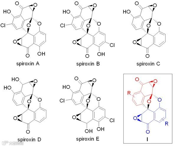 Spiroxins A-E是从加拿大迪克森湾水域一种珊瑚中发现的一类真菌代谢物,spiroxin A对革兰氏阳性菌具有抗菌活性,并对人卵巢癌肿瘤具有抗肿瘤活性。在分子结构上,spiroxins A-E具有独特的多环骨架I,由两个环氧萘醌单元通过一个碳碳键和一个螺环缩酮结构连接而成。该多环骨架含有6到7个手性中心,其中两个为连续的全取代手性季碳中心(图1)。