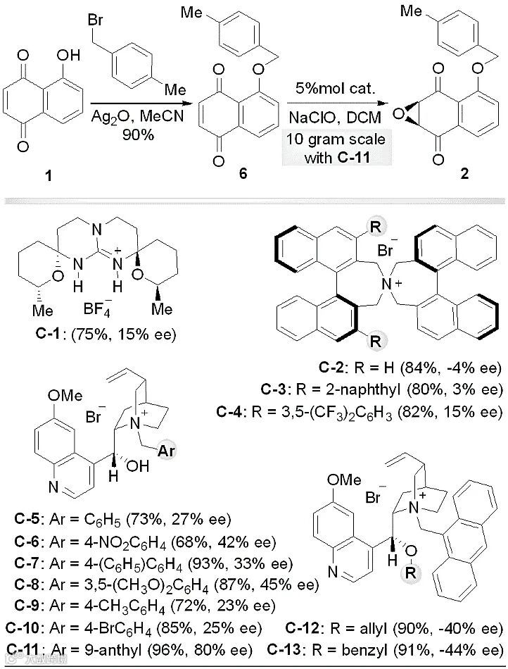 该课题组首先采用不对称相转移催化策略来实现5-取代萘醌6的不对称环氧化(图2)。经过一系列的催化剂筛选和条件优化,最终以优秀的产率(96%)和良好的对映选择性(80% ee)得到环氧化产物2。该步反应能以10 g的规模进行,环氧产物2通过重结晶可以将ee值提高到>99%。