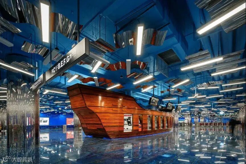 围绕“光与水”的主题,深浅不一的蓝色马赛克砖块铺满整个墙壁,与顶部LED灯光源一起,营造出海洋的效果,往下走仿佛进入了梦幻的海底世界。