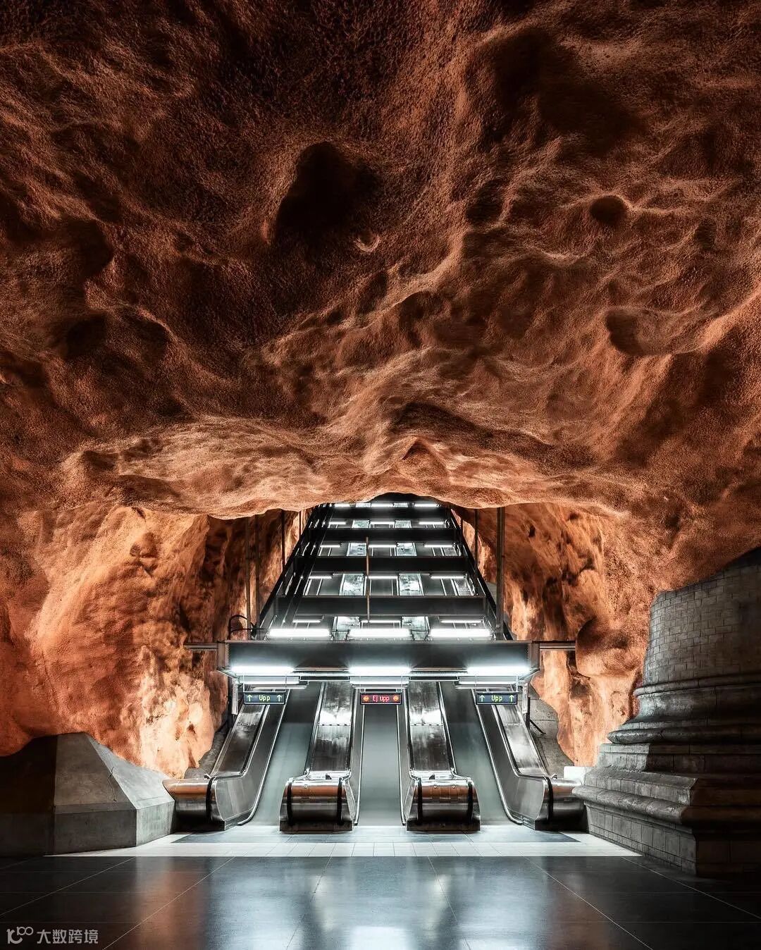 坑坑洼洼的天然岩石墙面呈棕红色,仿佛袭来的洪流,呈现着城市之下,地底的真实状态。