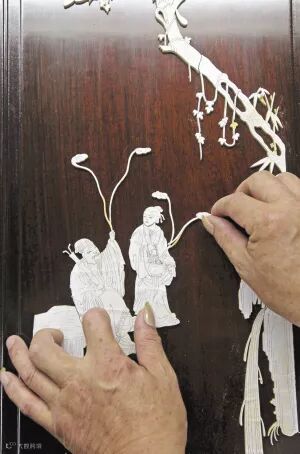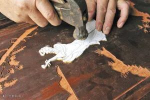 骨木镶嵌作品好看,活难学。所有的骨木镶嵌作品,不论大小,它的工序都是一样的。画底稿、锯图案、凿木、镶嵌、拼接、拉刀筋,每一道工序都不得有一点点的含糊。