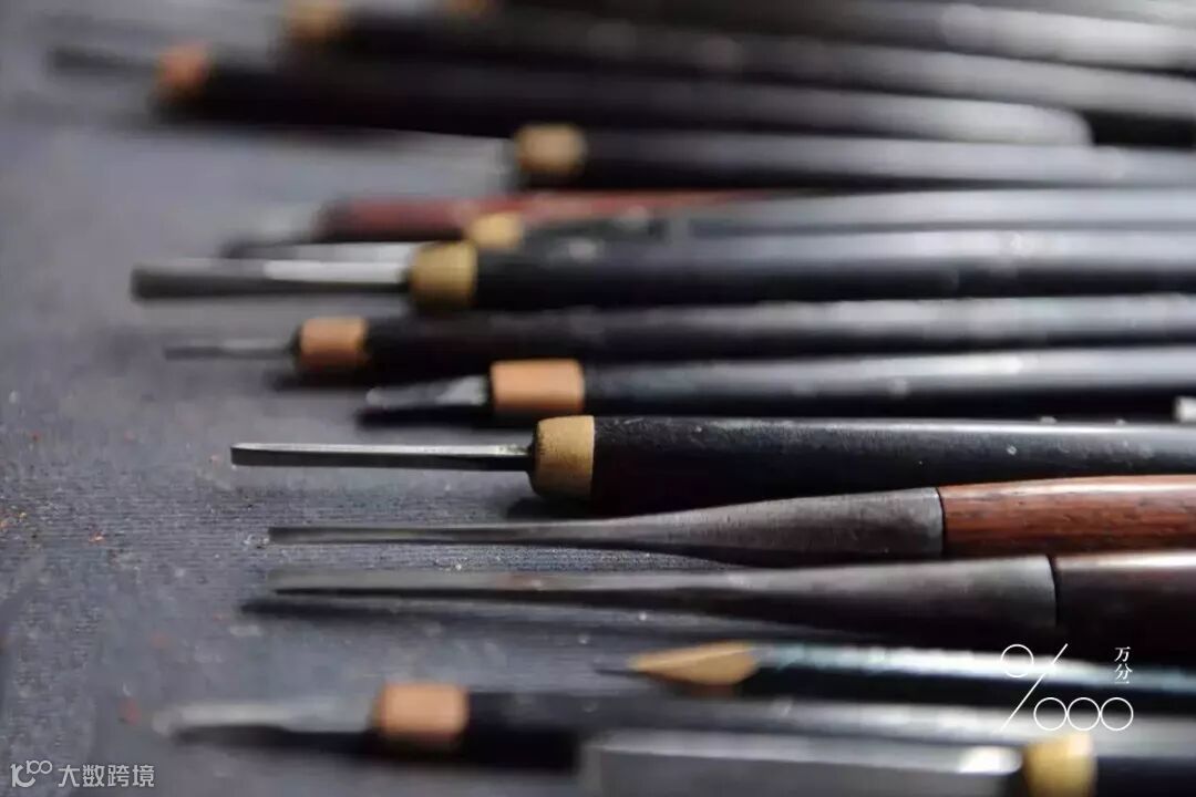 在甘金云的工作台上光是骨木镶嵌的工具就有一百多种,为了更好的创作,有些工具还是他自己手工做的。