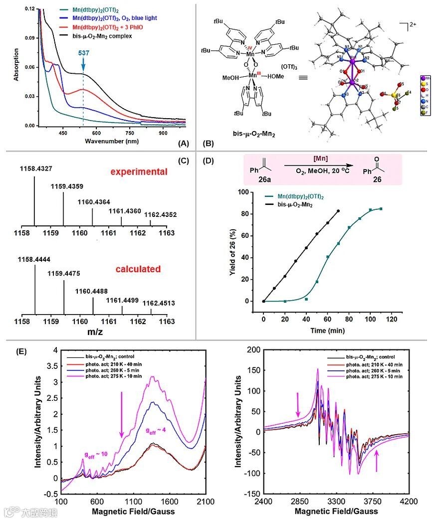 随后,作者对反应的机理进行了详细的解析。通过紫外波普表征、单晶X射线衍射、高分辨质谱以及电子顺磁共振波普分析,对非血红素锰络合物活化氧气的过程进行了解析(图3)。结果表明,在蓝光激发下,非血红素Mn(dtbpy)2(OTf)2络合物能在甲醇溶液中迅速活化氧气,生成非对称结构的bis-μ-O2-Mn2双核锰氧络合物。进一步动力学研究表明,该双核锰氧络合物是烯烃氧化裂解过程中至关重要的催化剂的稳定态(resting state),虽然其本身无催化活性,但其光解生成单核Mn(IV)-oxo是驱动烯烃氧化反应的关键物种,且该光解过程为反应的速控步。另外,相关研究表明,甲醇在反应过程中不仅作为反应溶剂,同时也作电子、氢供体辅助Mn(dtbpy)2(OTf)2活化氧气形成bis-μ-O2-Mn2,且该氧气活化过程表现出反同位素效应。