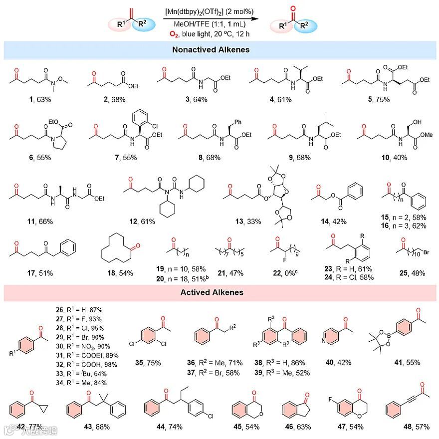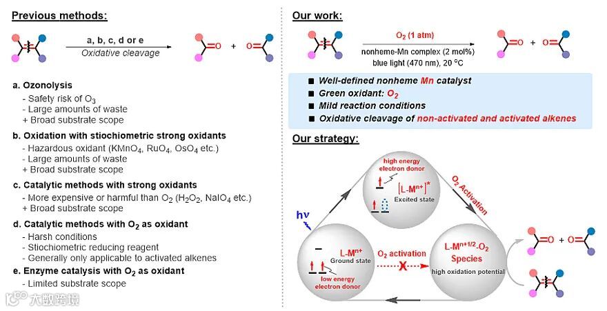 烯烃作为一类非常重要的化学原料,在有机合成化学中扮演者举足轻重的作用。例如,通过对其C=C双键衍生化,可以获得一系列高值精细化工品。而C=C双键氧化断裂作为烯烃衍生化反应中的一类重要分支,自上世纪以来,一直被合成化学家广泛关注和研究。在传统有机合成中,选择性烯烃C=C双键氧化断裂一般通过臭氧化反应来实现。虽然该方法已被广泛的应用于药物、天然产物等精细化工品的合成,但是使用臭氧导致的安全、环境污染等问题极大的限制了其发展。因而在过去的几十年里,人们试图寻求一些臭氧替代物,以及开发绿色催化过程,来解决上述安全和环境污染等问题。但时至今日,能在温和条件下,利用廉价、易得、安全的氧化剂,实现高效、高选择性的烯烃氧化断键的方法仍鲜有报道。近日,利物浦大学的肖建良团队开发了一类仿酶非血红素锰络合物,通过光辅助氧气活化的策略,首次实现了温和条件下非活化烯烃的有氧氧化断裂反应(图1)。
