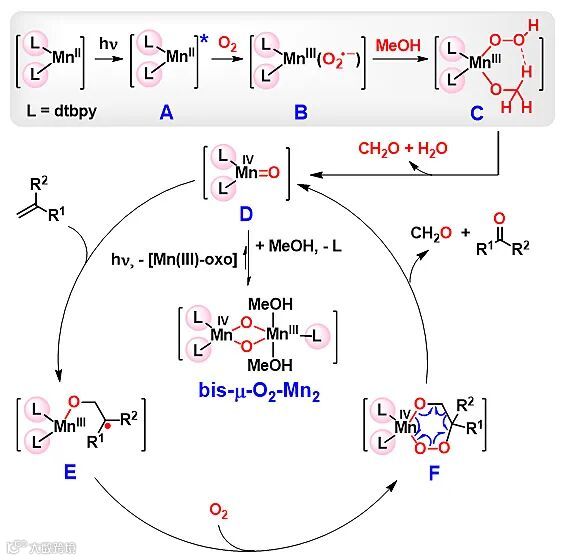 最后,作者对该锰催化的烯烃有氧氧化裂解反应进行了详细的机理解释(图4)。首先,非血红素Mn(dtbpy)2(OTf)2络合物在蓝光激发且甲醇参与下,实现了氧气的活化,经由中间体物种A、B、 C,最终形成物种Mn(IV)-oxo D。由于中间体D具有非常高的活性,在反应过程中,倾向于被进一步稳定形成off-cycle的bis-μ-O2-Mn2物种。而该bis-μ-O2-Mn2物种在光照情况下,能可逆的裂解成活性物种D,进而实现活性中间体物种活性的调控。物种D具有自由基的性质,与烯烃发生自由基加成反应,形成物种E。E进一步和氧气结合形成F,最后实现化学键断裂得到目标产物。