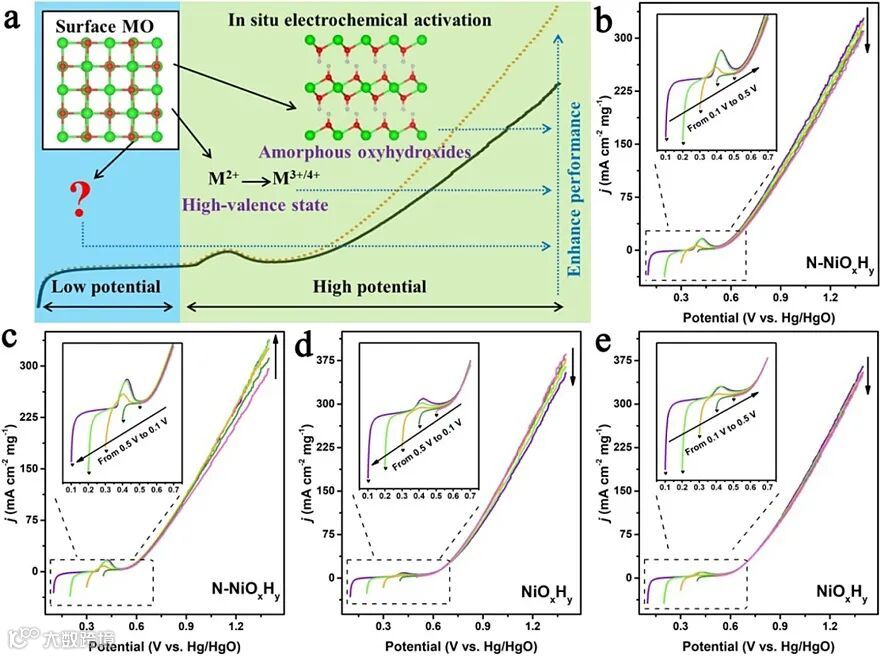 图1.(a)OER过程表面重构相关研究示意图。(b-d)负电流对于NiOxHy和N-NiOxHy OER性能影响。图片来源:Angew. Chem. Int. Ed.
