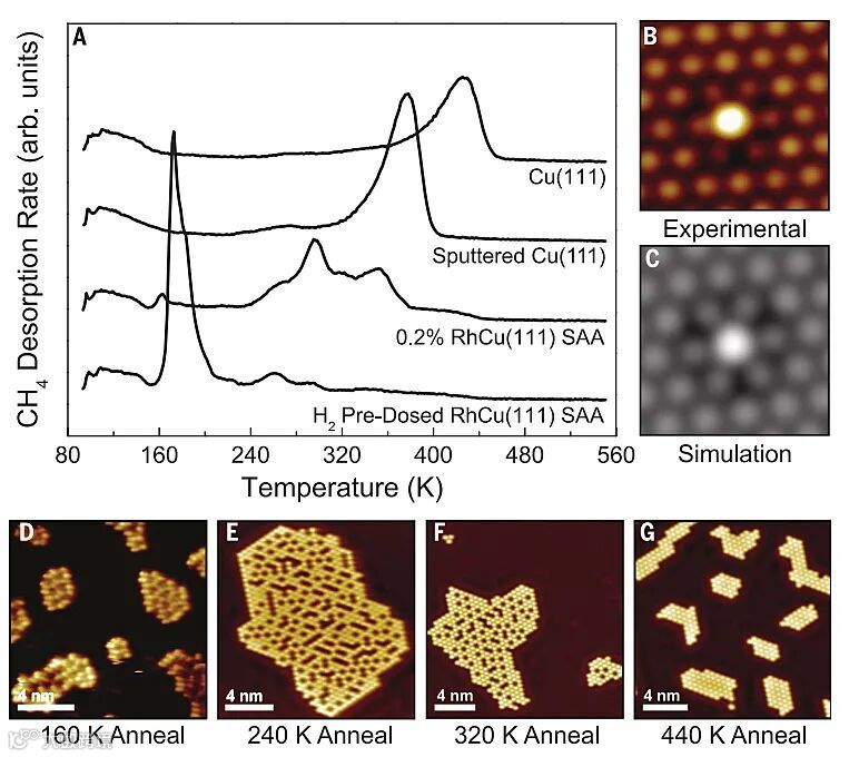 为了测试上述理论预测并研究各个反应步骤,作者以RhCu(111) SAA 催化剂为模型进行了表面科学和高分辨率成像研究。他们在Cu(111)界面上沉积Rh单原子(其中Rh : Cu = 1 : 100)来构建RhCu(111) SAA催化剂模型,并用CH3I来研究RhCu(111) SAA催化剂模型的C-H键活化情况。如图2A所示,程序升温脱附(TPD)实验显示Cu(111)表面上C-H键活化的起始温度约为430 K,这一结果与DFT计算结果一致。相比之下,当在Cu(111)表面上负载Rh单原子时,TPD实验显示C-H键活化温度有所降低并且产生多个低温脱附峰,其中最低的C-H键活化温度约为160 K,这对应于Rh 位点解离的氢与甲基进行的氢化过程(即CH3(ads) + H(ads)→CH4(g))。此外,300 K附近产生的脱附峰是由于甲基的 C-H键活化引起的(即CH3(ads)→CH2(ads) + H(ads)),随后是~350 K处产生的较小脱附峰(对应于CH4 解吸)。为了跟踪反应中间体,作者将 RhCu(111) SAA置于CH3I中并在不同温度下退火后进行了 LT-STM 实验(图2D-G)。当退火至~160 K时,观察到CH3I分子簇的形成(图2D);~240 K时观察到C-I键断裂(图2E);~320 K时观察到大部分甲基反应并解吸为CH4(图2F);~440 K时观察到表面上吸附的物种仅为I原子(图2G)。需要指出的是,当温度升高至~840 K时,仍未观察到积碳的生成。