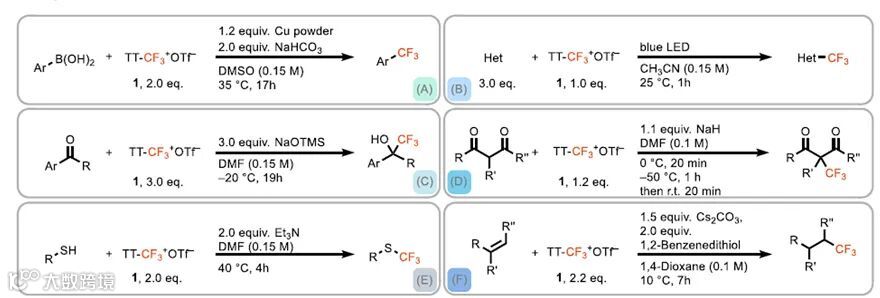 目前,三氟甲基化学的发展离不开三氟甲基试剂,而大多数亲电三氟甲基化试剂都是基于高价碘或硫化物(如Togni试剂I/II、Umemoto试剂等,图7)。事实上,三氟甲基反应大多是经历以下三种历程(即CF3–、CF3·和CF3+),并且目前尚未开发出同时具有以上三种特性的三氟甲基试剂。值得一提的是,Ritter教授团队利用噻蒽(TT)与三氟甲磺酸酐成功地合成了一种新型的三氟甲基试剂——TT-CF3+OTf–(图8)[5](点击阅读详细),并以Cu介导芳基硼酸的偶联反应、光介导CF3·对杂环的取代反应、硫醇/硫酚的三氟甲基化反应、烯烃的氢化三氟甲基化反应、酮的亲核三氟甲基化以及1,3-二酮的亲电三氟甲基化等六种反应展示了该试剂同时具有亲电、亲核和自由基反应特性(图9),是一种全能的三氟甲基试剂,在三氟甲基化合物的合成中展现出巨大的潜力。
