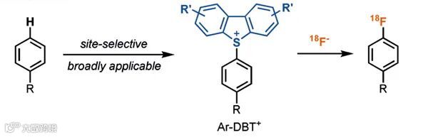 有机氟化物具有特殊的物理化学性质,广泛存在于天然产物和药物分子中,并在医药、材料等领域中具有重要的应用。然而,要想实现后期位点选择性 C-F 键的构建仍颇具挑战。为此,Ritter教授利用光氧化还原催化成功地实现了芳基噻蒽鎓盐的后期位点选择性 C-F 键构建(图4) [2] 和芳烃的位点选择性后期[18F]氟化(图5)[3]。