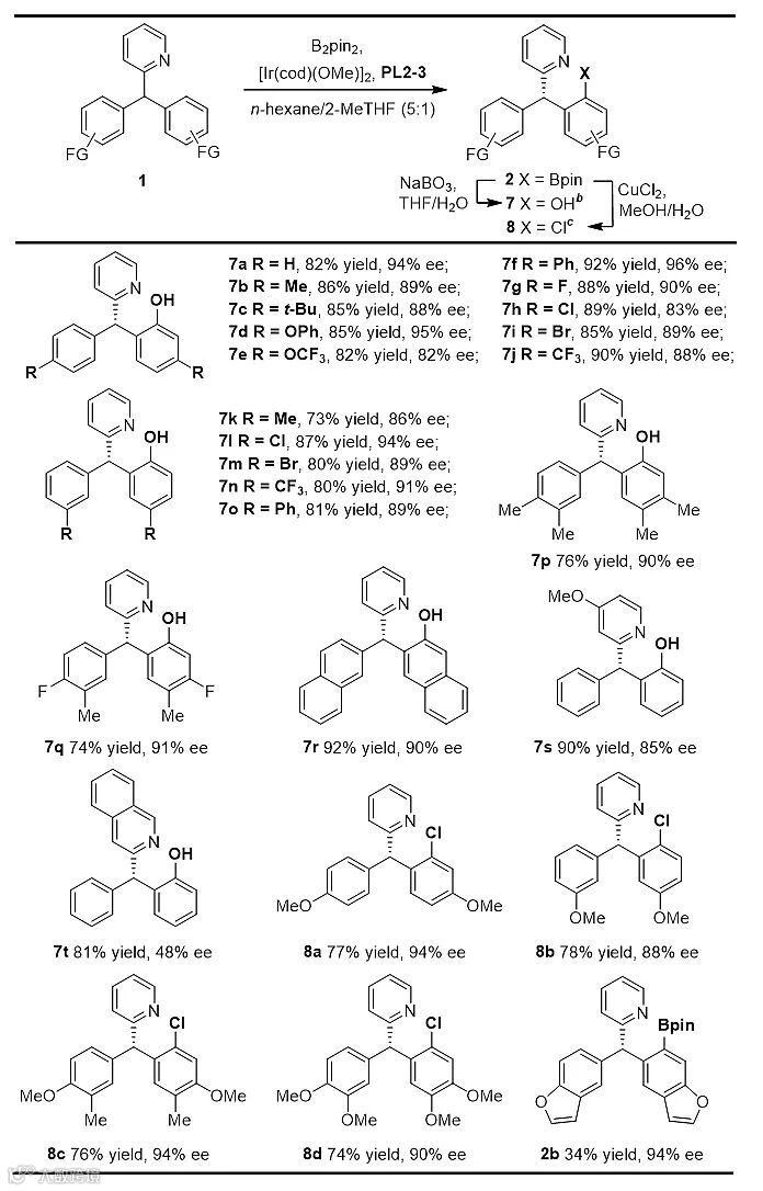 合成了一系列手性吡啶衍生的N,B配体之后,作者对反应条件进行了筛选,确定了最优条件(3 mol% [Ir(cod)(OMe)]2, 7 mol% PL2-3, 1.5 eq B2pin2, n-hexane/2-MeTHF (5:1, v/v), 60℃)。通过将配体、催化剂和B2pin2预搅拌,避免了背景反应对产物对映选择性的影响。随后,作者对底物的普适性进行了考察(图3)。底物苯环的间位或对位引入吸电子基团或给电子基团,反应都给出了较高的收率和对映选择性。对于间位底物,反应发生在位阻较小的位置(7k-7o, 8b)。有趣的是,当底物的对位含有苯基或苯氧基时,给出了最高的对映选择性(7d, 7f),作者猜测可能是催化循环的决速步骤中,配体的苯基和反应底物的苯基之间存在着π-π相互作用导致的。对于稠环或杂环底物,反应同样给出了较高的对映选择性(7r, 2b)。同时,作者对于非对称底物的动力学拆分也做了简要的研究,同样取得了较好的结果(87%-94% ee, 25-43的s值)。