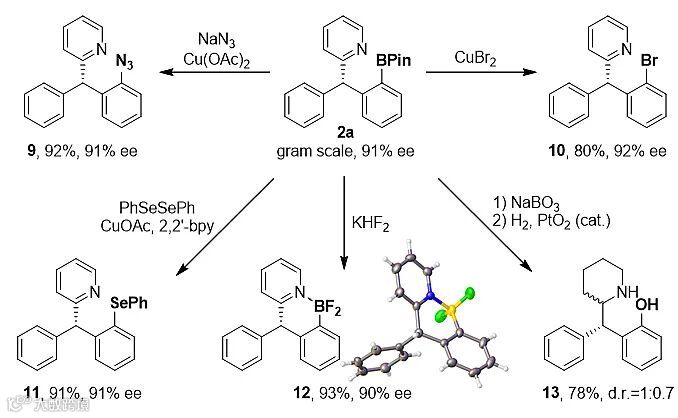 为了考察该催化反应的实用性和高效性,作者将反应的规模提高到克级,并减少了催化剂的用量(1 mol%),反应依然可以得到高对映选择性结果(92% yield,91% ee)。产物的硼酸酯基团可以高效地转化为叠氮、溴、硒醚、二氟化硼等基团。产物经过氧化/氢化,可以顺利得到药物分子中常见的手性哌啶衍生物(图4)。