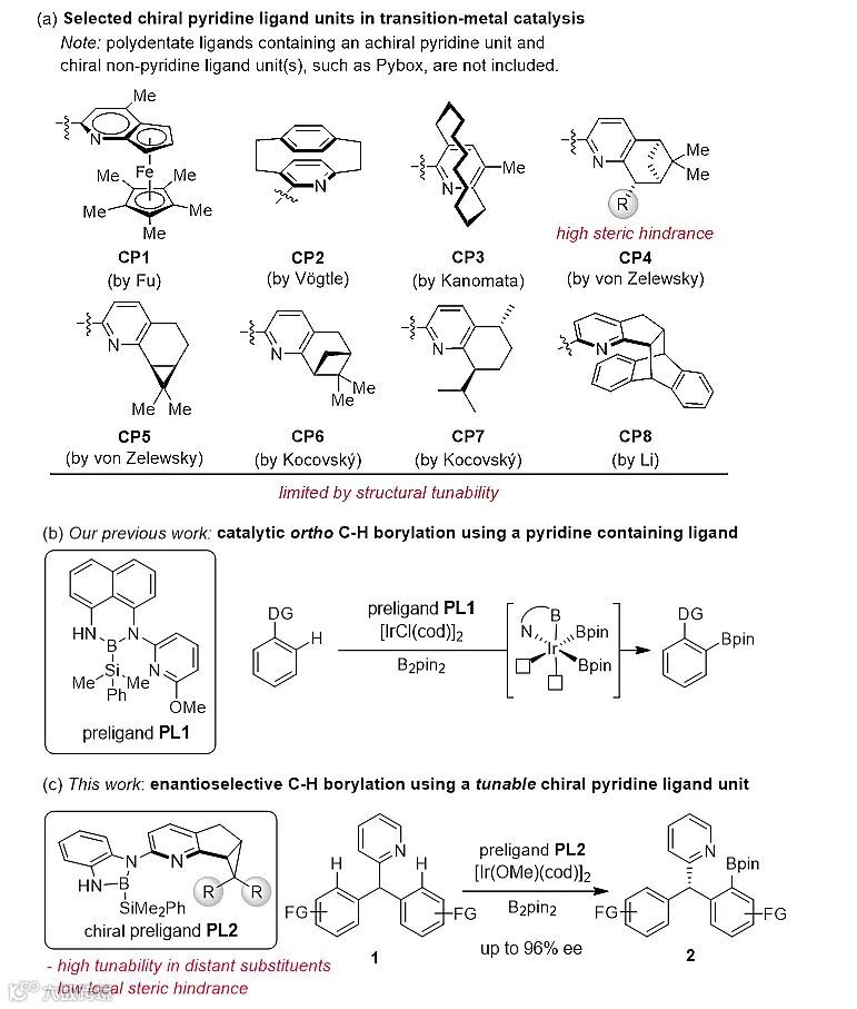 该工作设计合成了一种结构可调新手性吡啶配体,并将其应用于不对称C-H硼化反应,高对映选择性地实现了三芳基甲烷的不对称C-H键硼化。更重要的是,该工作证明了这种新型手性吡啶配体的确可以在不对称催化反应中发挥关键性的作用。考虑到吡啶配体(如2,2’-联吡啶)在催化反应中的广泛用途,该手性吡啶骨架衍生的配体有望在不对称催化领域发挥更广泛的作用。
