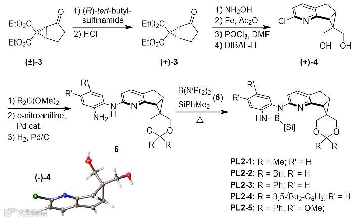 针对上述问题,西安交通大学李鹏飞课题组设计了一种结构可调新手性吡啶骨架。首先,采用稠环骨架减少配体可能的空间构象,增加其在不对称催化中的可预测性;第二,相比于常见的在吡啶2-位引入甲基等取代基,在吡啶并五元环骨架的基础上再稠合一个三元环能够有效减小吡啶氮原子周围的空间位阻,从而提高配体的反应活性;第三,相较于已有的手性吡啶配体,在环丙烷上引入羟甲基,实现了配体结构的高度可调性。为了验证新手性吡啶骨架在不对称催化中的效果,作者进一步合成了一系列手性吡啶衍生的N,B-配体(如图2)。