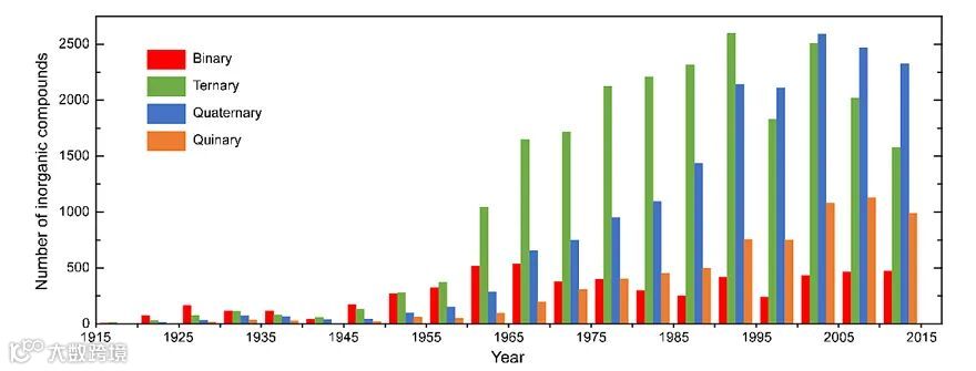 为了探究无机化合物的发展历程,通过对无机晶体结构数据库(ICSD)进行统计分析,发现收录的二元和三元化合物数量分别在70年代和90年代后呈现明显下降,四元和五元化合物的新增数量也在过去20年趋于平稳。这一趋势可以理解为在现有的新材料开发模式下,纯无机晶体化合物发展的一个高峰期可能已经成为过去。由于有限的元素种类,这一趋势的出现并不令人惊讶。但是仍需思考无机化合物材料未来新的增长点,这将在很大程度上依赖于新材料开发方法和模式上的创新。
