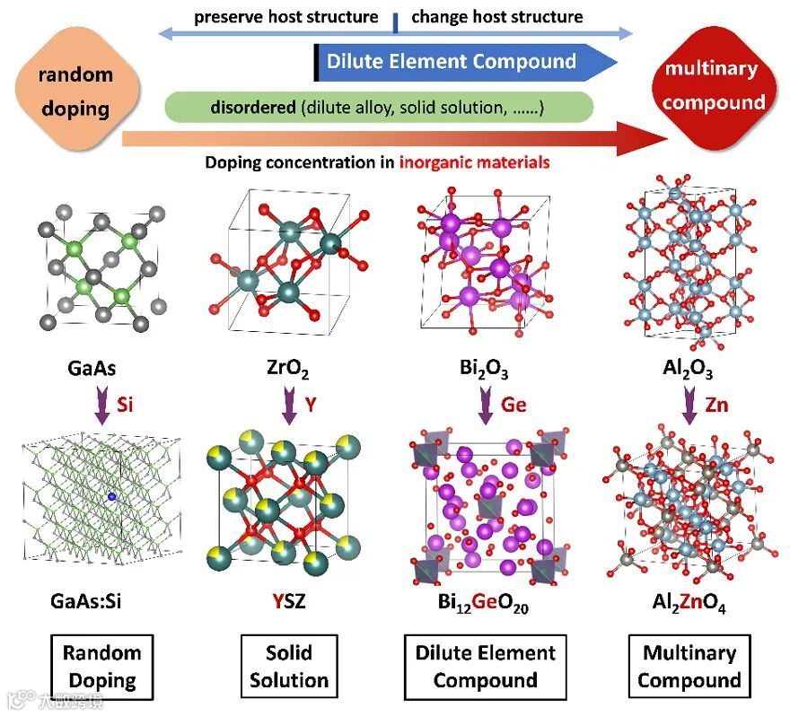 图2. 无机材料中的掺杂元素随着浓度提高会从一个极端(随机分布)到达另一个极端(多元化合物)。在某些基体材料中,当掺杂达到某个临界浓度后会导致相变发生。而在稀元化合物中掺杂元素会从无序转变为有序分布,这与固溶体可以定性的区分。