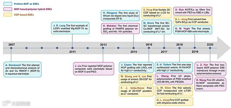 图1. 基于MOF和COF设计的固态电解质研究工作的时间轴